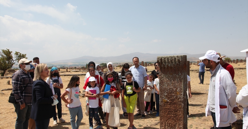 Ahlat taşı, Ahlat Selçuklu Meydan Mezarlığı'nın tarihi, taş ustaları ve semboller hakkında bilgilendirilen öğrenciler, yaptıkları çizimleri mezar taşları üzerindeki asıllarıyla karşılaştırdı.