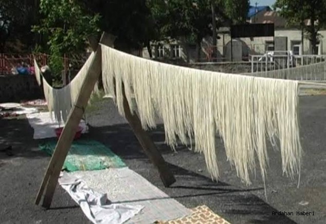 Ardahan merkez Atatürk mahallesinde yaşayan kadınlar kış sofralarının vazgeçilmez lezzetlerinden olan ve binbir zahmetle hazırlanan erişteler için hazırlıklara başladı. Asırlık gelenekler arasında olan ve lezzetiyle kış sofralarını süsleyen erişte kesimi için her gün birinin evinde toplanan kadınlar, bahçelerde kurdukları bir alanda bir yandan erişte hamuru yoğururken bir yandan da kestikleri erişteleri iplere dizerek kurutuyor. Kurutma işleminin ardından toplanan erişteler, ocak ateşinde kavrulduktan sonra paketlenip kışlık yemek yapımına hazır hale getiriliyor. Saatlerce süren zahmetli ve yorucu işlemlerin ardından masalardan kalkan kadınlar, koyu bir sohbet ve semaver çayı eşliğinde günü noktalıyor.