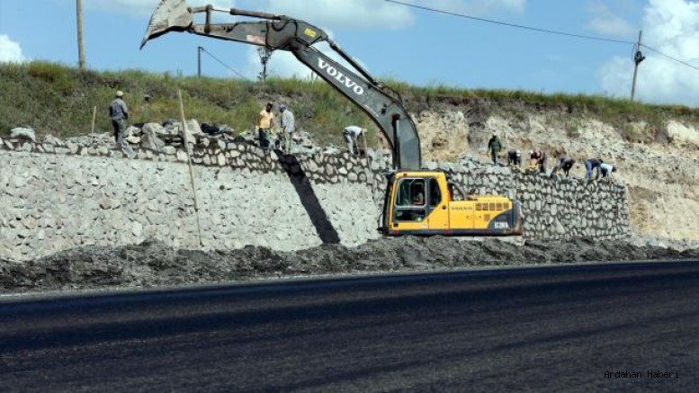 Ardahan'da güvenli ve konforlu ulaşım için bölünmüş yollar yapılıyor, heyelan tehlikesi bulunan bölgelere taş duvarlar örülüyor.