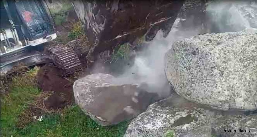 Ardahan da dev kayalar kaldırılarak, sıkışan köpek kurtarıldı