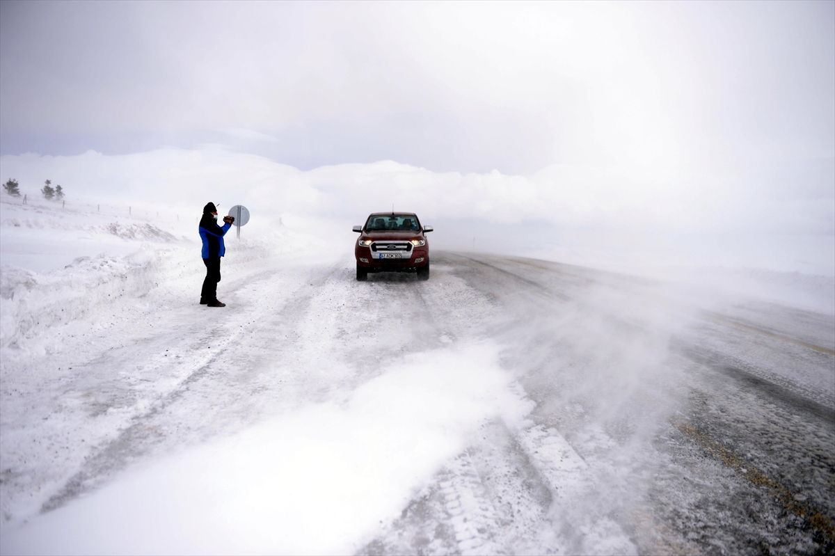 Ardahan-Şavşat kara yolunun Sahara mevkisinde yoğun tipiye rağmen bazı sürücüler, cep telefonlarının yağışı görüntülemeye çalıştı.
