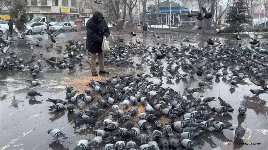 Ardahan'da etkili olan kar yağışı ve soğuk hava nedeniyle bazı vatandaşlar, güvercinlere yem desteğinde bulundu.