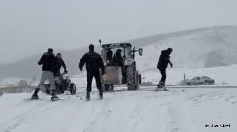 Ardahan da Kar Yağışını Eğlenceye Dönüştürdüler: Traktör Arkasında Kayak Keyfi