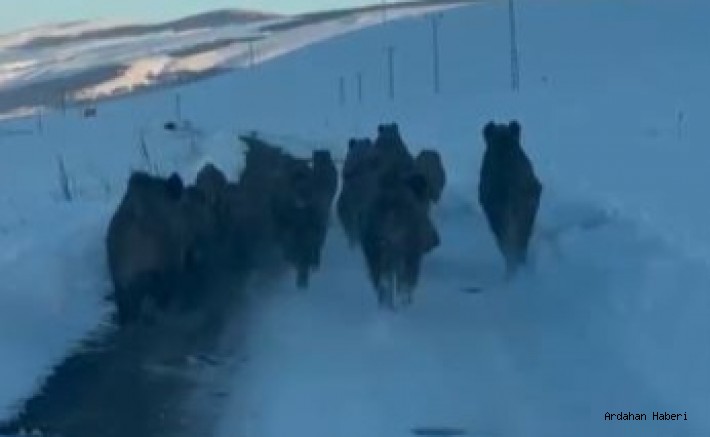 Ardahan – Merkeze bağlı Akyaka köyü yolunda sabah saatlerinde yaban hayatı sürprizi yaşandı. Vedat Özgür isimli sürücünün otomobiliyle seyir halinde olduğu sırada aniden yoluna çıkan domuz sürüsü, ilginç görüntülere sahne oldu.