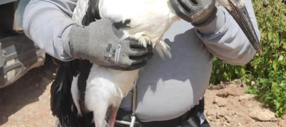 Ardahan'da ayağına ip sarıldığı için yuvasından ayrılamayan leylek ekiplerce kurtarıldı