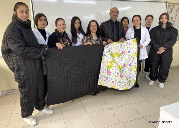 Ardahan'daki Şehit Türkmen Tekin Mesleki ve Teknik Anadolu Lisesi öğrencileri, tatilde de uyku tulumu ve battaniye üretip para kazanıyor.
