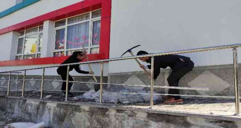 Müdür yardımcısı Hüseyin Biçer, öğrenciler açısından tehlike oluşturan kar birikintileri ile buz kütlelerini temizlediklerini söyleyerek, ''Nisan ayının sonlarındayız. Okulumuzun kuzey tarafında biriken kar ve buz kütlelerini temizliyoruz'' dedi.
