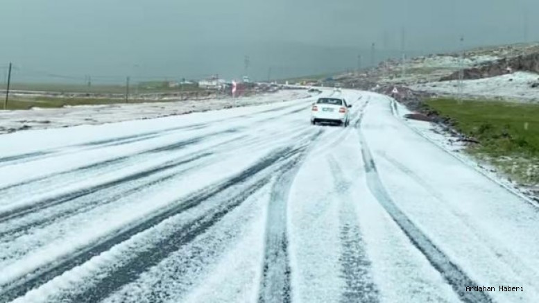 Dolu yağışı sonrası Ardahan-Göle karayolu beyaza büründü. Aniden bastıran dolu yağışı sebebiyle trafik akışı zaman zaman yavaşladı.