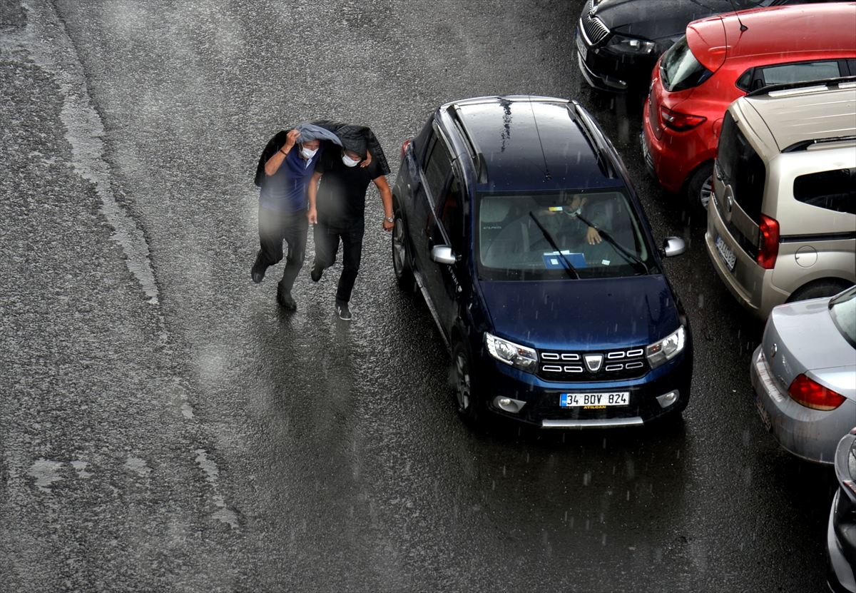 Bazı vatandaşlar da binaların çatılarının altına girerek yağıştan korunmaya çalıştı.