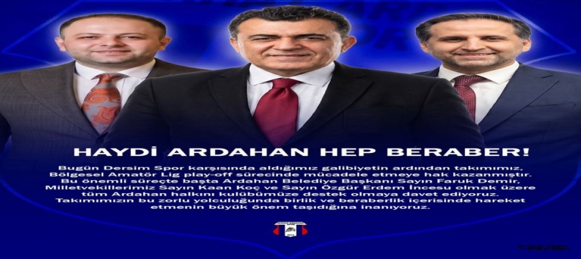 "Play-off sürecinde başta Ardahan Belediye Başkanı Sayın Faruk Demir, Milletvekillerimiz Sayın Kaan Koç ve Sayın Özgür Erdem İncesu olmak üzere; tüm iş insanlarımızı, sivil toplum kuruluşlarımızı ve cefakar Ardahan halkını kulübümüze destek olmaya davet ediyoruz."
