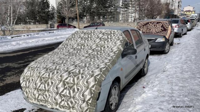 Ardahan'da soğuk hava yüzünden ağaçlar kırağı tuttu, araçların camları buzla kaplandı.