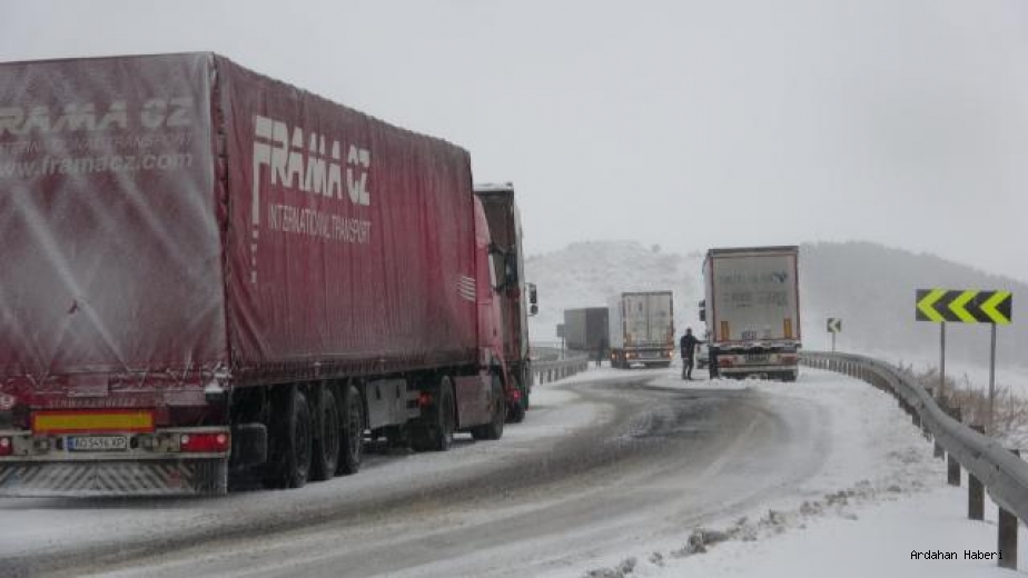 Ardahan'da kar yağışının ardından etkili olan tipi ve buzlanma nedeniyle onlarca TIR yollarda kaldı.