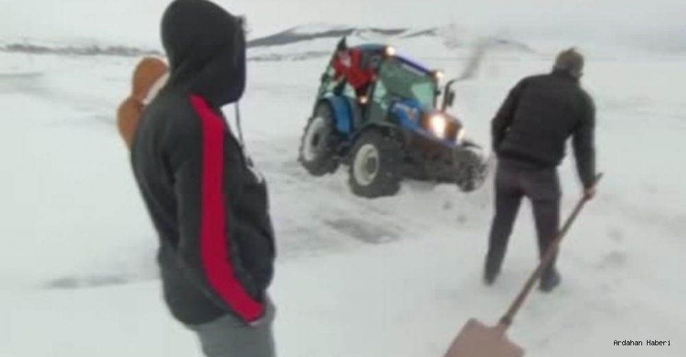 Ardahan'da etkili olan kar yağışı nedeniyle birçok köy yolunda ulaşım güçlükle sağlanıyor. Merkeze bağlı Yokuşdibi köyünde minibüs ile traktör, tipi nedeniyle kontrolden çıkıp kara saplandı. Köy yolunda kara saplanan traktör ile minibüsü kurtarmak için köylüler seferber oldu.