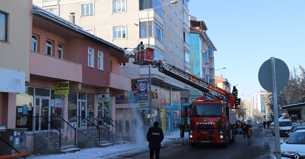 Ekipler yaptıkları çalışma kapsamında, çarşı merkezindeki binaların çatılarından sarkarak tehlike oluşturan buz ve kar kütlelerini itfaiye aracının merdiveni yardımıyla düşürdü.