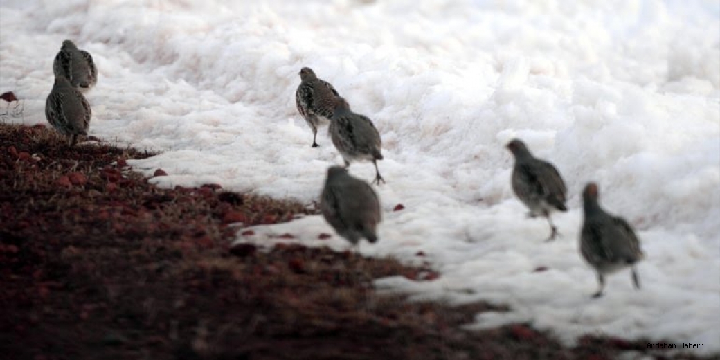 Ardahan'ın bir kısmı karla kaplı ovası, kınalı kekliklerle şenlendi.
