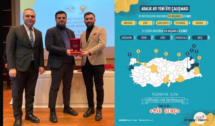 AK Parti Ardahan İl Başkanı Kaan Koç ve AK Parti Gençlik Kolları Ardahan İl Başkanı Emre Karakoyun’un özverili çalışmaları sonucunda il ve ilçe teşkilatlarıyla beraber Türkiye geneli önemli bir başarıya imza atıldı. AK Parti Ardahan Gençlik Kolları, Aralık ayı üye çalışmasında diğer illeri geride bırakarak 1’nci oldu.