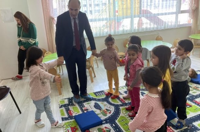 Kentteki TGİSB Kızılay Anaokulu'nu ziyaret eden İl Milli Eğitim Müdürü Erhan Bulut, burada çocuklarla oyun oynayıp ücretsiz yemek uygulamasının işleyişiyle ilgili sorumlulardan bilgi aldı.