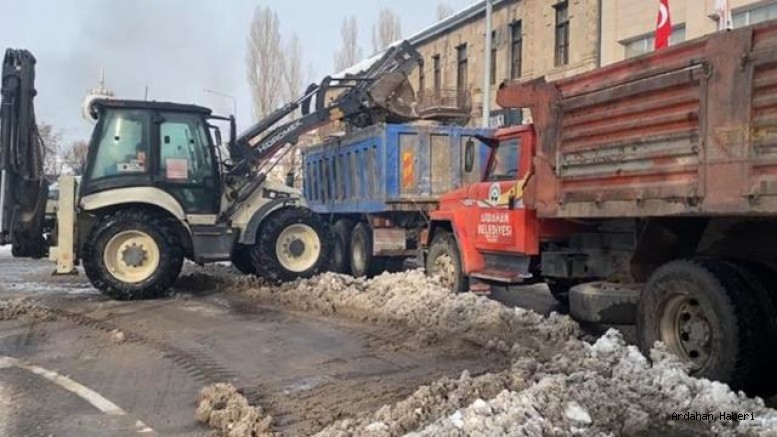 Ardahan'da dün başlayan yoğun yağışın ardından cadde ve sokaklarda biriken kar, belediye ekiplerince il merkezi dışına taşınmaya başlandı.