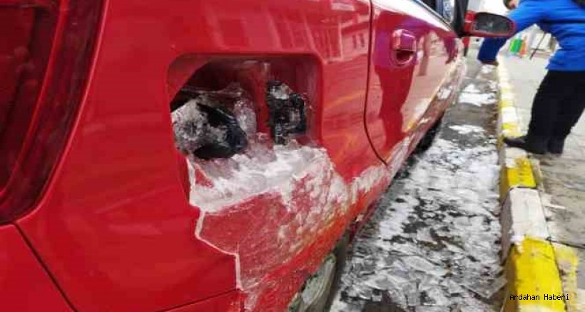 Ardahan'da kar yağışın ardından etkili olan dondurucu soğuklar nedeniyle çatılarda buz sarkıtları oluştu, bir aracın depo kapağı dondu.