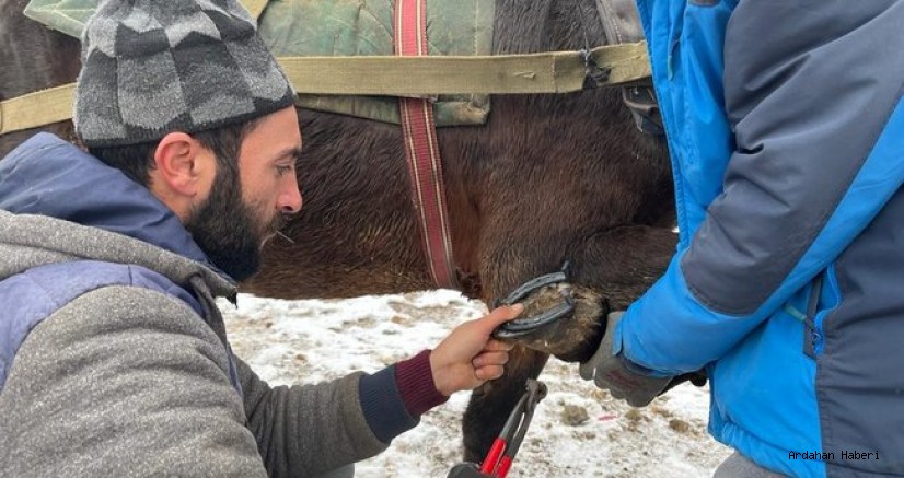 Ardahan'da köylüler, binek ve yük aracı olarak kullandıkları atların kışın karda ve buzda kaymamaları için kendi imkanlarıyla buz nalı taktırıyorlar.
