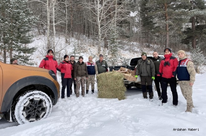 Doğa Koruma ve Milli Parklar (DKMP) Ardahan Şube Müdürlüğünce, karla kaplanan Yalnızçam ormanlarında hayvanlara yem bırakmak amacıyla çalışma yapıldı.