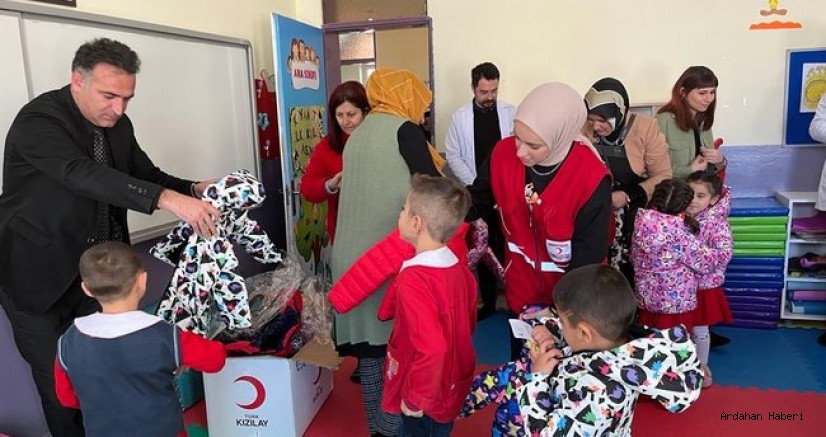 Ardahan Halk Eğitim Merkezi Müdürlüğü tarafından Göle Kayaaltı Köyü İlk ve Ortaokulu öğrencilerine Kızılay tarafından gönderilen kışlık mont karne hediyesi olarak dağıtılırken, bir yandan da öğrencilerin saç bakımı yapıldı.