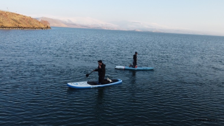 Donmaya yakın Çıldır Gölü’nde -6 derece hava sıcaklığında bu sporu yapan sporcular soğuk havaya aldırmadan kürek sörfünün tadını çıkardılar.