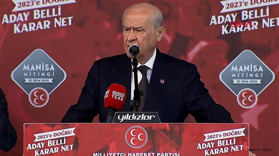 "2023'e Doğru: Aday Belli, Karar Net" temalı açık hava toplantıları çerçevesinde MHP’li tek büyükşehir belediyesi olan Manisa’ya gelen MHP Genel Başkanı Devlet Bahçeli, Cumhuriyet Meydanı’nda vatandaşlara seslendi. Meydana giden güzergahta yoğun kalabalığın karşıladığı Bahçeli’ye, tarihte kurulan 16 Türk devletinin bayraklarını taşıyan gençler ile atlı ekip eşlik etti. Kendisini bekleyen vatandaşları aracından selamlayan Bahçeli, daha sonra açık hava toplantısının gerçekleştirileceği alana geldi. Burada vatandaşlara seslenen Bahçeli, “Biz Türkiye’yi çok seviyoruz. Taş taşa değmeyince duvar olmayacağını, birlik ve kardeşlik olmayınca dirlik olmayacağını idrak ve ifade ediyoruz. Yıkılmamızı gözleyenler var, dikkat ediniz. Birbirimizi girmemizi düşleyenler var uyanık olunuz. Türkiye’miz üzerinde emeli ve gözü olanlar var, tetikte durunuz. Ancak bizim de Manisa’mız, Aydın’ımız, Denizi’miz, Muğla’mız, Uşak’ımız var; büyük bir milletimiz dünya üzerinde bir yıldız gibi parlayan kocaman bir ülkemiz var. Korkakların üzerine yürüyoruz. 7 düvelin üzerine gidiyoruz. Biz yürüdükçe siniyorlar. Biz direndikçe siliniyorlar. Teslim olmayacağız, taviz vermeyeceğiz. Tehir etmeyeceğiz. Millet diyeceğiz, vatan diyeceğiz. Al bayrağın altında hep beraber toplanıp bağımsızlığımıza asla gölge düşürmeyeceğiz. 2023 yılı muazzez bir fırsattır. 2023 yılı Türk tarihin dönüm noktalarından birisidir. 2023, Türkiye Cumhuriyeti’nin 100. yıl dönümüdür. Aynı zamanda hem cumhurbaşkanı hem de 28. Dönem milletvekilliği genel seçimlerinin yapılacağı sandık ve demokrasi yılıdır. Türkiye’ye tuzak kuranlar 2023’te alt edilecektir. Cumhurbaşkanı adayı bulabilmek için icazet yarışına girenler gelsinler Manisa’ya baksınlar da muhteşem coşkuyu görsünler. Koştura koştura Amerika Birleşik Devletleri’nde soluğu alan işbirlikçilerin yüreği yetiyorsa şu imrenilecek heyecan dalgasına kulak versinler. Türkiye’de bulamadıklarını yabancı ülkelerde arayanlar, terör örgütüne destek, bölücülüğü payanda olanlar, ekmeğini yediği, suyunu içtiği, havasını soluduğu vatanını gittikleri ülkelerde şikayet edenler çok iyi bilsinler ki bizim adayımız belli kararımız nettir Cumhurbaşkanı adayımız da Sayın Recep Tayyip Erdoğan’dır. Hedefimiz Erdoğan’ın açık ara farkla yeniden cumhurbaşkanı seçilmesidir. Türkiye Büyük Millet Meclisi’nde milletvekili sayısı ve siyasal destek itibariyle çok güçlü bir Milliyetçi Hareket Partisi grubunun ve Cumhur İttifakı’nın tecessüm ve tecelli etmesidir. 2023 seçimleri Türkiye’nin kaderini tayin edecektir. Ya geleceğimiz zillete düşüp heba ve heder olacaktır ya da cumhurun cesaret ve dirayetiyle bütün korkuluklar yıkılacak bütün oyunlar bozulacaktır. Ya ‘Yurdum’ diyeceğiz, ya da yokluğa mahkum olacağız. Ya istiklal ve istikbal haklarımızdan vazgeçecek ya da bu haklarımızı sonsuza kadar var olmanın yol haritasını belirleyeceğiz. Mandacılara, mayası ve meşrebi zehirli olanlara ya boyun eğeceğiz ya da lider ülke Türkiye’nin kapısını aralayacağız. Artık başka çare ve başka seçenek kalmamıştır” dedi.