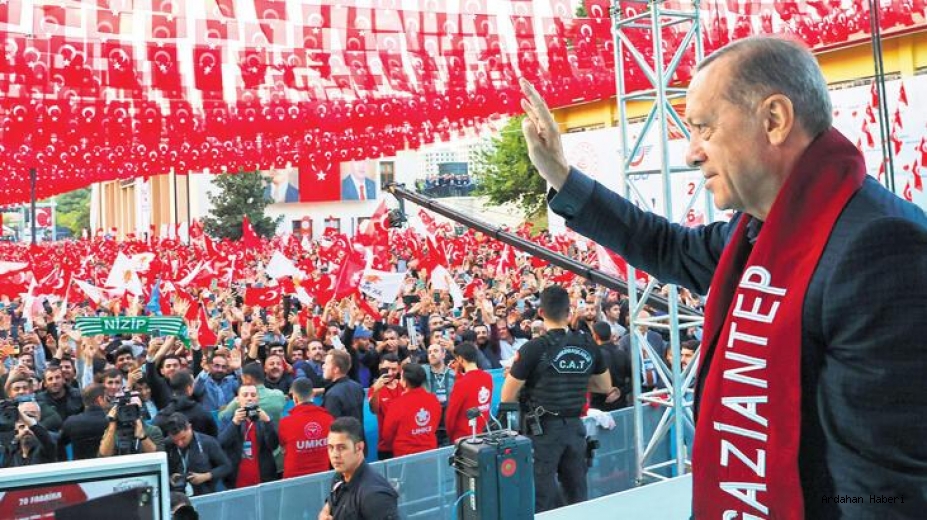 OYUNLARI BOZDUK: Yaklaşık Ülkemize 20 yılda asırlık eser ve hizmetler kazandırırken, attığımız her adımda, girdiğimiz her mücadelede, verdiğimiz her kavgada yanımızda milletimiz vardı, yanımızda Antep vardı. Sordum, şu anda İstasyon Meydanı’nda ne kadar Antepli var? Dediler ki şu an itibarıyla 60 bin, gelişler devam ediyor dediler. Biz vesayetin oyunlarını işte sizlerle beraber bozduk. Şimdi de Türkiye Yüzyılı programımızla Cumhuriyetimizin ikinci asrını milletimizi hayallerine kavuşturmanın vesilesi haline dönüştürmeye hazırlanırken yine milletimizle birlikte, yine Antep’te sizlerle birlikte yola çıkıyoruz.