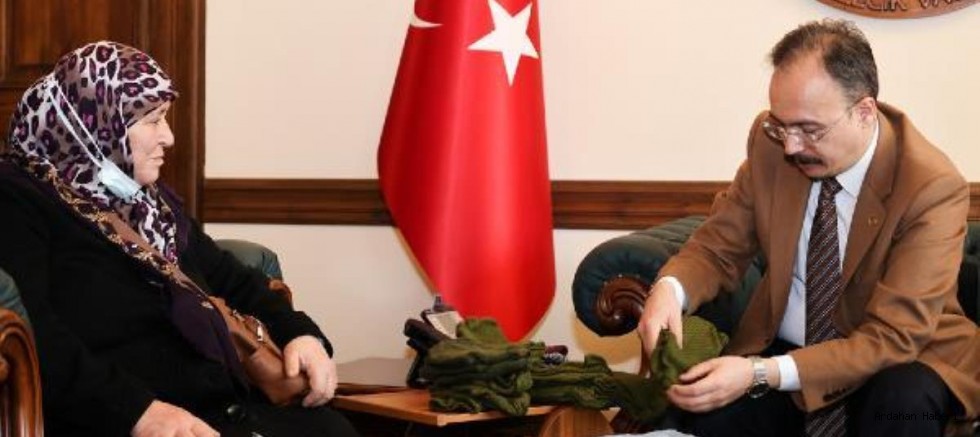 BİLECİK'in Pazaryeri ilçesinde Emizade Yalamacılar (73), askerler için ördüğü yün çorapları Vali Kemal Kızılkaya'ya teslim etti.