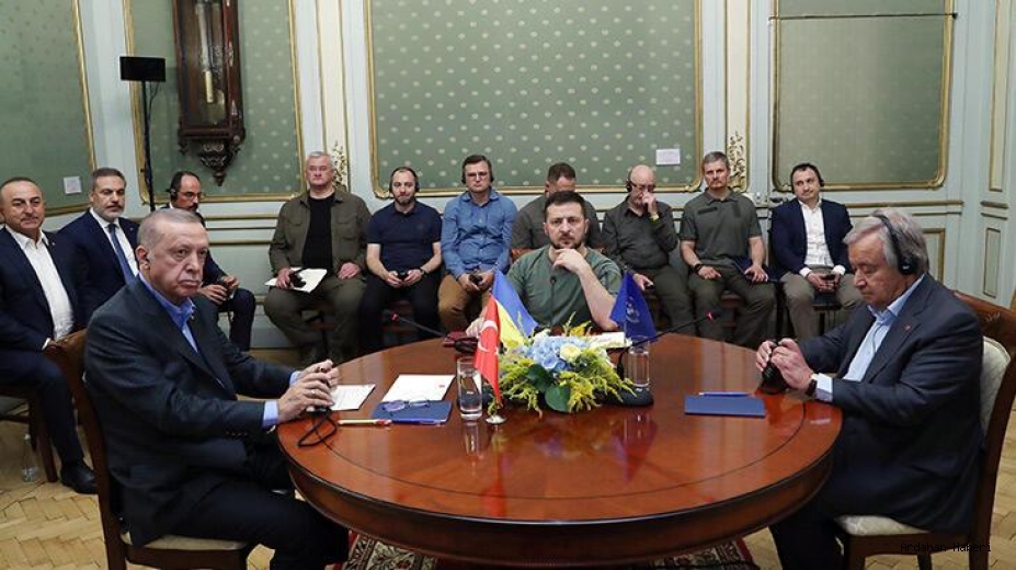 Cumhurbaşkanı Erdoğan, tarihi Potocki Sarayı'nda saat 14.40'ta Zelenskiy ile görüşme gerçekleştirdi. İki liderin görüşmesinin ardından Erdoğan, Zelenskiy ve Guterres üçlü görüşmeye geçti.