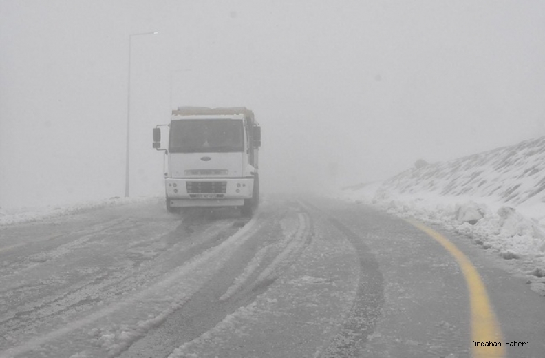 Karayolları 183. Şube Şefliği görevlileri, yüksek noktalarda kar ile tipinin ulaşımı yer yer etkilediğini belirterek, açılan yolu kullanacak tır sürücülerine araçlarına zincir takmaları uyarısında bulundu.