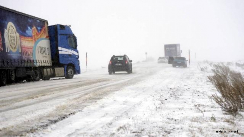 ArdahanKaradeniz'e bağlayan Ardahan-Şavşat kara yolunda kar ve tipi nedeniyle tır geçişlerine izin verilmiyor.