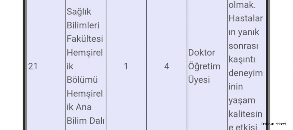 Ardahan Üniversitesi, 33 akademik personel alacağını duyurdu. Ancak yayımlanan ilanlarda bazı kadrolara “özel şart” eklenmesi dikkat çekti. Özellikle Sağlık Bilimleri Fakültesi Hemşirelik Ana Bilim Dalı için belirlenen özel şart, hastalarda yanık sonrası kaşıntı deneyimleri üzerine araştırma yapmış olmayı içeriyor.
