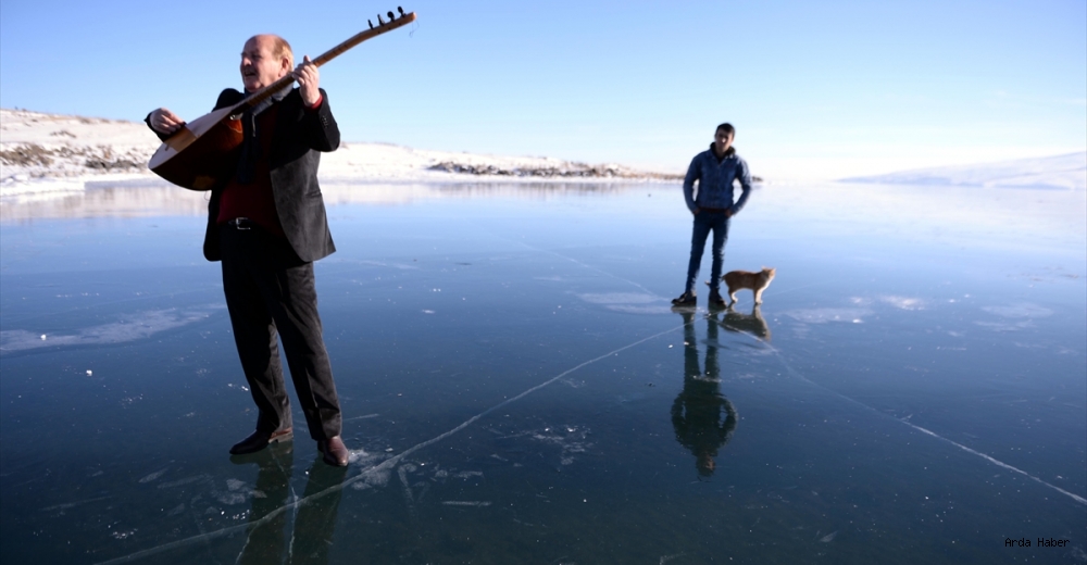 Ardahanlı ozan Yener Yılmazoğlu, yüzeyinin büyük bölümü donan Çıldır Gölü üzerinde, sazını eline alarak birbirinden güzel türküler söyledi