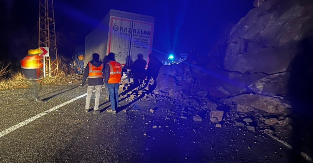 ARTVİN'in Şavşat ilçesinde yaşanan heyelanda yamaçtan kopan taş, toprak ve kaya parçaları, yola aktı. Kaya parçalarının çarpmasıyla devrilen seyir halindeki TIR'da hasar oluşurken, ulaşıma kapanan Artvin- Ardahan karayolunda, ekipler temizlik çalışması başlattı.