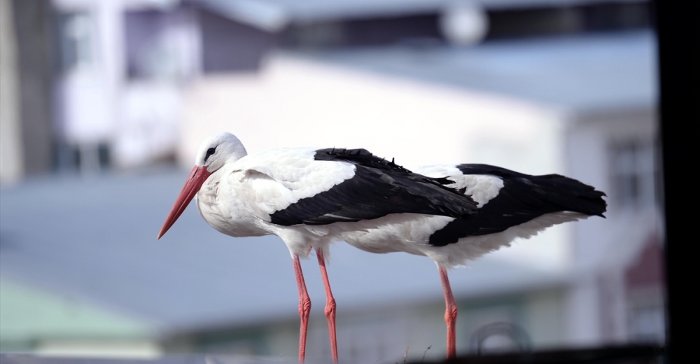 Bina çatılarına konan leylekler kente renk katıyor.