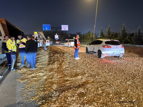 Sürücünün kazayı yara almadan atlattığı öğrenilirken, ekipler道路 trafiğin normale dönmesi için yola dağılan yükü temizleme çalışması başlattı.