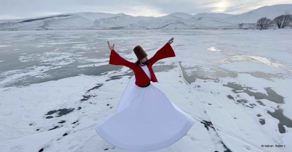 Ardahan Üniversitesi (ARÜ) Teknik Bilimler Meslek Yüksekokulu Öğretim Görevlisi Özkan Karadavut, tanıtım için Ardahan-Kars sınırlarındaki Çıldır Gölü'nün buzla kaplı yüzeyinde sema gösterisi gerçekleştirdi.
