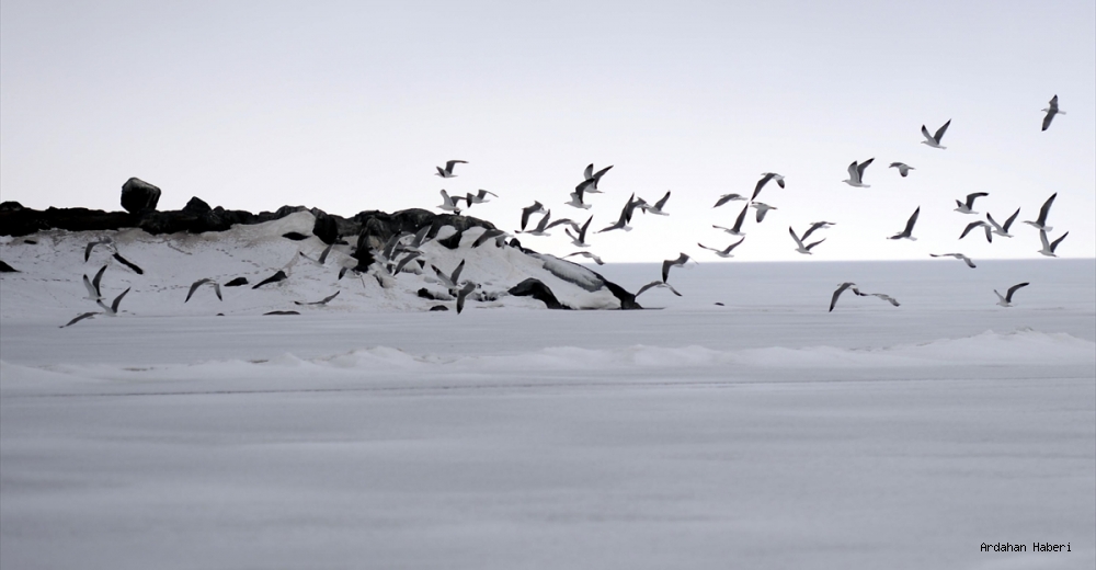 Kars-Ardahan sınırında yer alan buzla kaplı Çıldır Gölü'ne bu yıl erken gelen martıları, balıkçılar ekmekle besliyor.