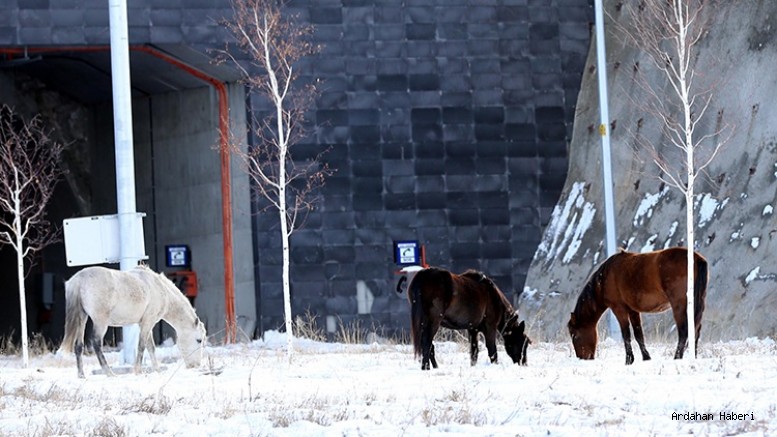 Çıldır–Aktaş Gümrük Kapısı’na geçişi sağlayan Aşık Şenlik Tüneli’nin Aktaş Kavşağı mevkisinde karla kaplı alanlarda otlamaya çalışan yılkı atları, özellikle kavşak ve yol kenarında dolaşarak sürücülerin yavaşlamasına yol açtı. Zaman zaman yola inen atlar nedeniyle araçlar kontrollü şekilde ilerledi.