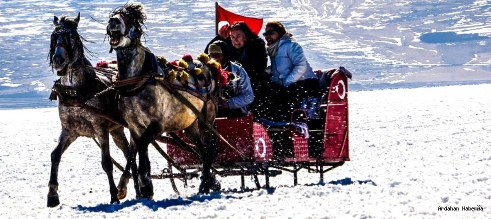 Yerli ve yabancı turistler Çıldır Gölü'nde balık tutmanın yanı sıra, kar motoru ile donan gölün etrafını turladıktan sonra atlı kızaklar ile göl üzerinde tatlı bir gezintiye çıkıyor.