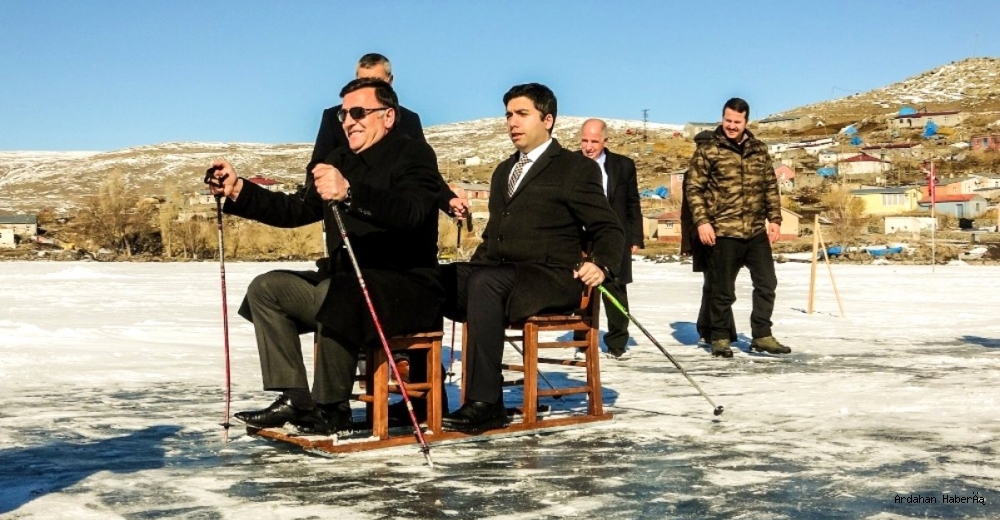 Organizasyon kapsamında gölün Ardahan tarafına gelen Çıldır Kaymakamı Alper Taş, Belediye Başkanı Kemal Yakup Azizoğlu ve diğer yetkililer, sandalyeli buz kızağı ve kar bisikletine binip göl üzerinde gezinti yaptı.