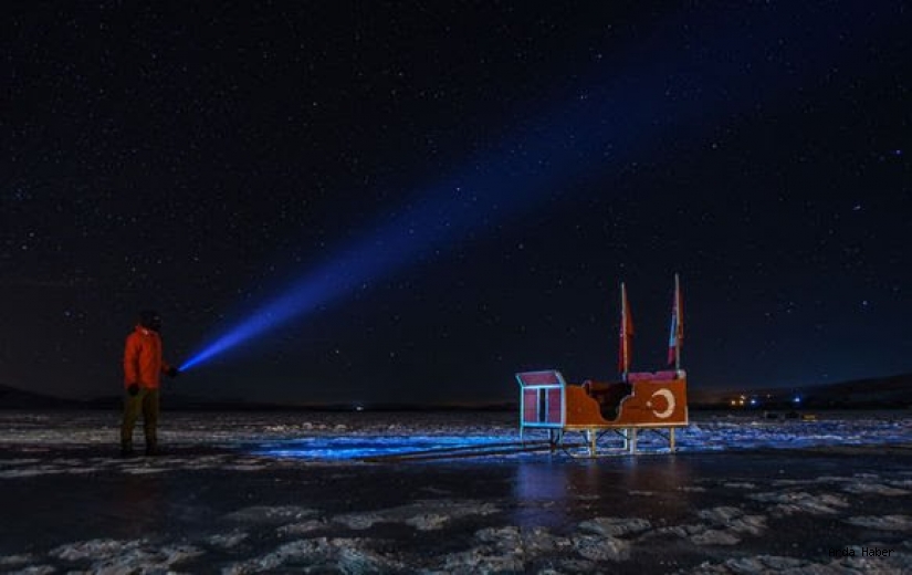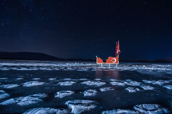 Kars-Ardahan sınırları içerisinde yer alan ve yüzenin bir kısmı buz tutan Çıldır Gölü'nde gece gökyüzü uzun pozlama tekniğiyle görüntülendi.