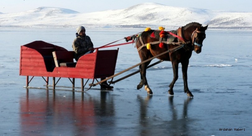 Ardahanlı kızakçı, turistleri rahatça gezdirebilmek için buzla kaplanan Çıldır Gölü üzerinde, türkü eşliğinde atını buza alıştırıyor.