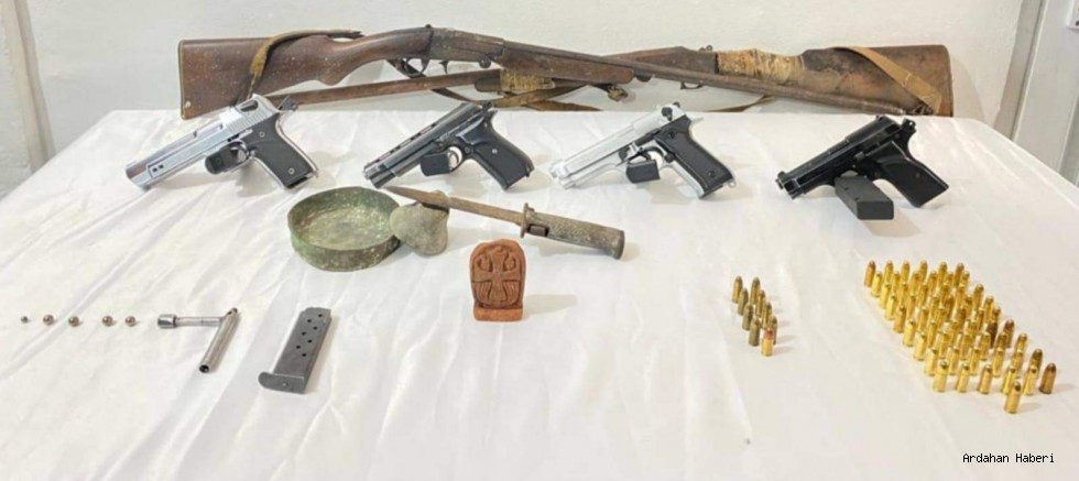 Jandarma ekipleri, Ardahan'ın Çıldır ilçesinde 4 zanlının adresine düzenledikleri baskında çok sayıda ruhsatsız silah ve tarihi eser ele geçirdi.