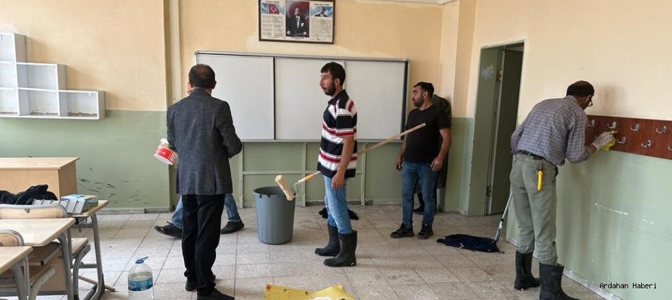 Çıldır Şehit Öğretmen Sezgin Yolcu Orta Okulunda öğrencilerin daha hijyenik ve temiz bir ortamda eğitim alması için hazırlıklar son sürat devam ediyor.