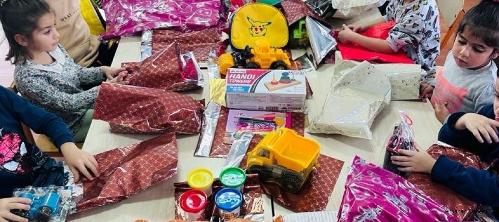 Çıldır Anaokulu öğrencileri almış oldukları hediyeleri öğretmenleri ile özenle hazırlayıp kendi elleri ile paketleyen ve süsleyen öğrenciler, hediyelere öğretmenlerinin yardımı ile kalplerinden geçen notları yazdırarak deprem bölgesindeki seçtikleri kardeş okula göndermek üzere hazırladı. Büyük bir mutluluk ve heyecan ile kendilerine verilen bu sorumluluğu layığı ile yerine getirmenin coşkusunu minik kalplerinde hissettiler. Paketlenen hediye ve oyuncaklar kardeş okula gönderilmek üzere okul idaresine teslim edildi.