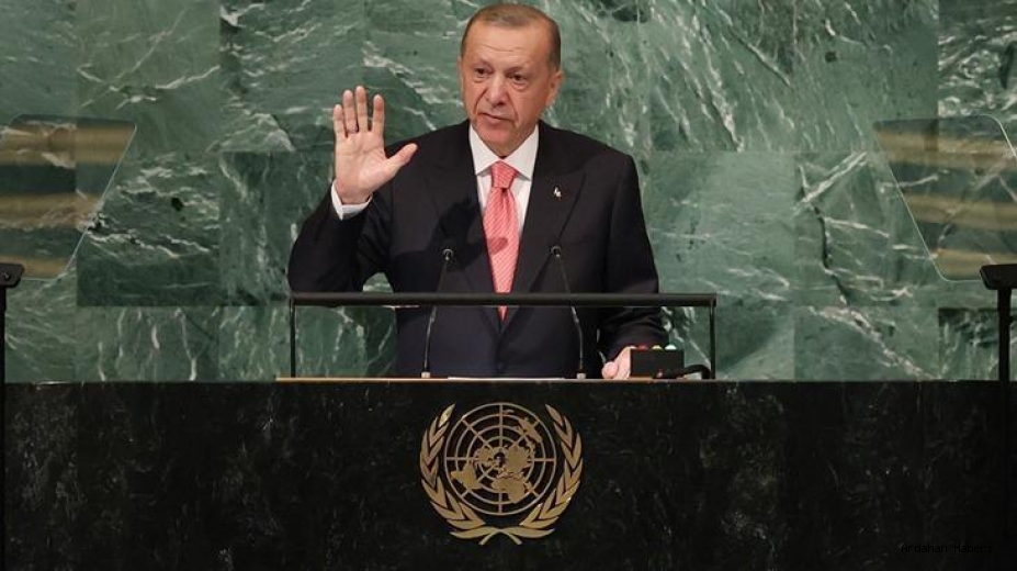 Cumhurbaşkanı Erdoğan'ın konuşmasından satır başları şöyle; Sayın Başkan, kıymetli devlet ve hükümet başkanları sayın Genel Sekreter sizleri şahsım, ülkem ve milletim adına saygıyla selamlıyorum. Güven ve dayanışma içerikli temayla toplanan genel kurulun tüm insanlık için hayırlara vesile olmasını temelli ediyorum. Karşımızdaki fotoğraf küresel ölçekte giderek daha fazla, daha karmaşık, daha tehlikeli sınamalarla karşı karşıya olduğumuzu gösteriyor. Kendi ülkemin kuzeyinde, güneyinde, doğusunda, batısında pek çok kriz, sosyal gerilim yaşanıyor. Sürekli büyüyen bu sınamalarla baş etmek her geçen gün daha da zorlaşıyor. Avrupa'nın doğu sınırlarında yaşanan savaş ekonomiden güvenliğe, her alanda ciddi sorunlar ortaya çıkardı.Küresel güçlerin ihtiraslarını kullanarak büyüyen terör örgütlerinin faaliyet alanları adet bir salgın gibi geniş coğraflara yaygınlaşıyor. Yabancı karşıtlığı ırkçılık ve islam düşmanlığının yeni bir krize dönüşme emareleri son bir yıldır endişe verici boyutlara ulaştı.İklim değişikliği ve buna bağlı doğal afetler günlük hayatımızın bir gerçeği haline gelmiştir. Türkiye 6 Şubat 2023 sabahı sayın genel sekreterin ifadesiyle yüzyılın en büyük doğal afetlerinden biriyle karşı karşıya kaldı. Bu kara günde ülkemize gösterilen dostluk bizler için önemli bir teselli kaynağıdır. Depremin yaralarını sarmak şehirlerimizi bir an önce ayağa kaldırmak için çalışmalarımızı yoğun bir şekilde sürdürüyoruz.Birkaç gün öncede Libya fırtına ve selin yol açtığı ağır yıkımlara maruz kaldı. Felaketin ardından Türkiye olarak, Libya'ya yardım için hemen harekete geçtik. Sivil toplum kuruluşlarımızla kendi imkanlarıyla bölgedeki çalışmalara katılıyor. Dünyanın neresinde mağdur varsa yanında yer alan bir ülke olarak Libyalı kardeşlerimizi de yalnız bırakmadık, bırakmayacağız. Ülkemiz gibi şiddetli bir depremle sarsılan Faslı kardeşlerimize de geçmiş olsun dileklerimi buradan iletiyorum.Küresel adaletsizlikleri ortadan kaldıran, ekonomik eşitsizliklerin üzerine giden barış, güvenlik, istikrara ve refah üreten etkili, kapsayıcı velhsahıl tüm insanlığın hayrına bir sistemin çağrımız giderek yankı buluyor.