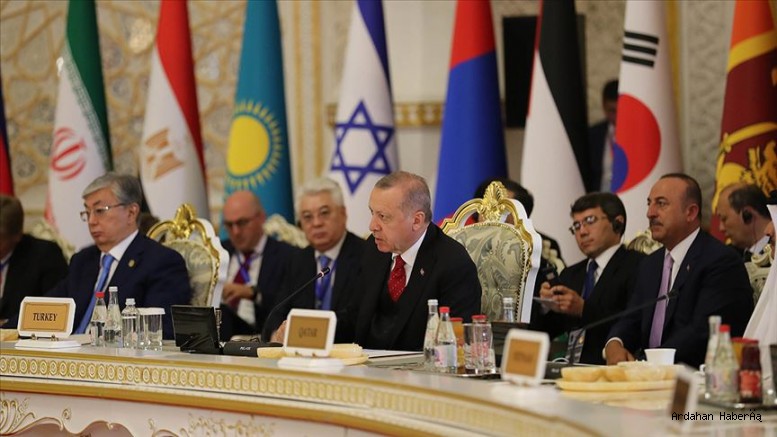 Zirve'nin bölgesel ve küresel hadiseler bağlamında kritik bir dönemde icra edildiğini belirten Erdoğan, "Asya'da İşbirliği ve Güven Arttırıcı Önlemler Konferansı'nın temelleri, aksakalımız Nursultan Nazarbayev'in vizyoner önerisiyle atılmıştır. Konferansımız, ortak çabalarımız sonucu içerikli, temsil kabiliyeti yüksek bir bölgesel foruma dönüşmüştür. Üye sayımızın artması bunun ispatıdır." diye konuştu.